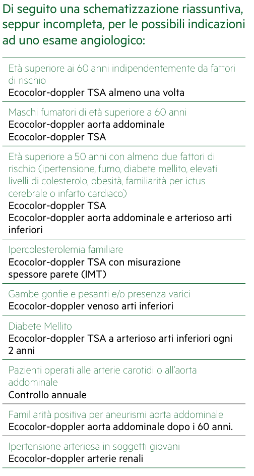 Le malattie cardiovascolari rappresentano la prima causa di morte nei paesi industrializzati. I principali fattori di rischio conosciuti sono il fumo di tabacco, l’ipertensione arteriosa, i livelli elevati di colesterolo nel sangue, il diabete mellito, l’obesità e la sedentarietà. Oggi siamo in grado di pianificare un’adeguata prevenzione con una attenta analisi dello stile di vita e con un’efficace diagnosi precoce. In quest’ottica l’ecocolor-doppler ha rivoluzionato il modo e la capacità di fare diagnosi e prevenzione di malattie come l’ictus cerebrale, la rottura di aneurismi dell’aorta addominale, le gangrene ischemiche agli arti inferiori, ed in misura significativa la tromboembolia polmonare. Particolarmente richiesto ed utile, è l’esame delle arterie del collo (in sigla TSA, ovvero tronchi sovra-aortici) indicato per la prevenzione dell’ictus cerebrale ischemico causato da restringimenti (stenosi) di una o entrambi le arterie carotidi o vertebrali. Di seguito una schematizzazione riassuntiva, seppur incompleta, per le possibili indicazioni ad uno esame angiologico:Il controllo nel tempo sarà programmato in base all’esito del primo esame ed all’eventuale persistenza di uno o più fattori di rischio.